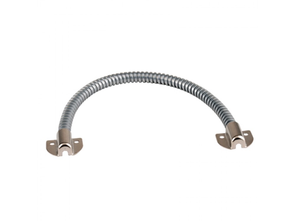 Гибкий переход дверной длинный, используется для защиты кабеля от повреждения и деформации. Состоит из гофрированной трубы и крепежных элементов. Сделан из сплава металлов (в основном цинк), утолщенный металл покрытый высокотемпературной эмалью, серого цвета. Тип установки: уличный/внутренний. Общая длинна 435мм. Размеры гофрированной трубы 348х20 мм. Внутренний диаметр 15мм. Вес 50 грамм.