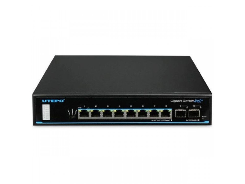 10-портовый неуправляемый PoE коммутатор UTP3-GSW0802S-POE с 4 портами РоЕ, которые могут определять и подавать питание устройствам на базе стандарта IEEE 802.3af/at (Wi-Fi точка доступа, IP-телефон, IP-камера и др.).