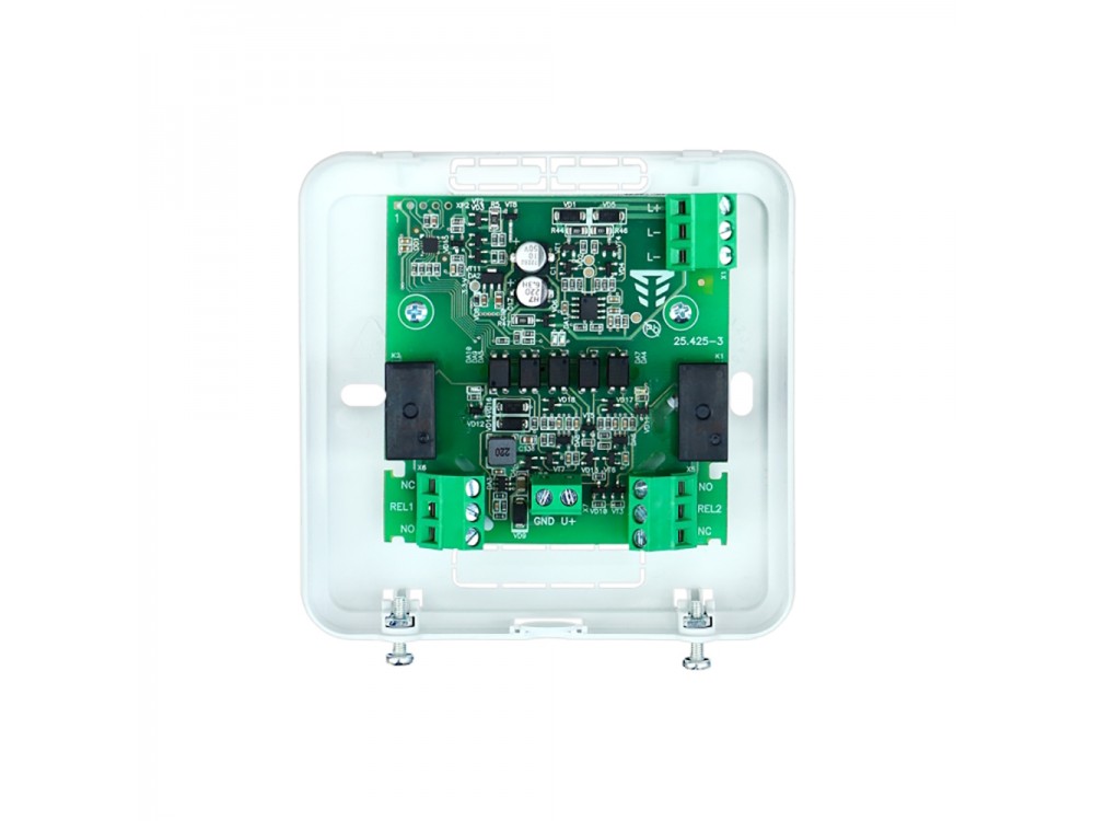 Подключается в адресный интерфейс и добавляет 2 мощных реле, которые способны коммутировать напряжение как постоянного, так и переменного тока. Оснащен изолятором короткого замыкания.