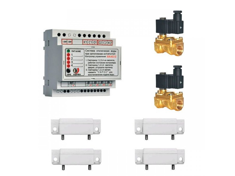 Комплект антизатопления Эконом NO 1/2 включает: контроллер управления – 1шт.; датчик затопления – 4шт.; электромагнитный клапан NO 1/2" – 2шт.